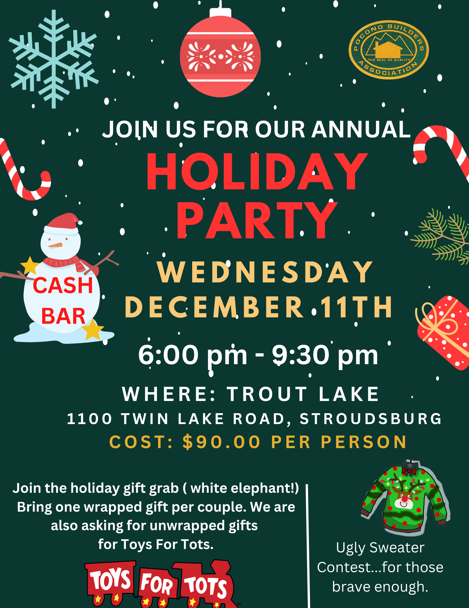This year, we’re thrilled to bring the festivities to Trout Lake Resorts, a stunning new venue for our association. Enjoy a night of great company, delicious food, and the always-entertaining White Elephant Gift Exchange—a favorite holiday tradition! We can't wait to celebrate with you! 🎄